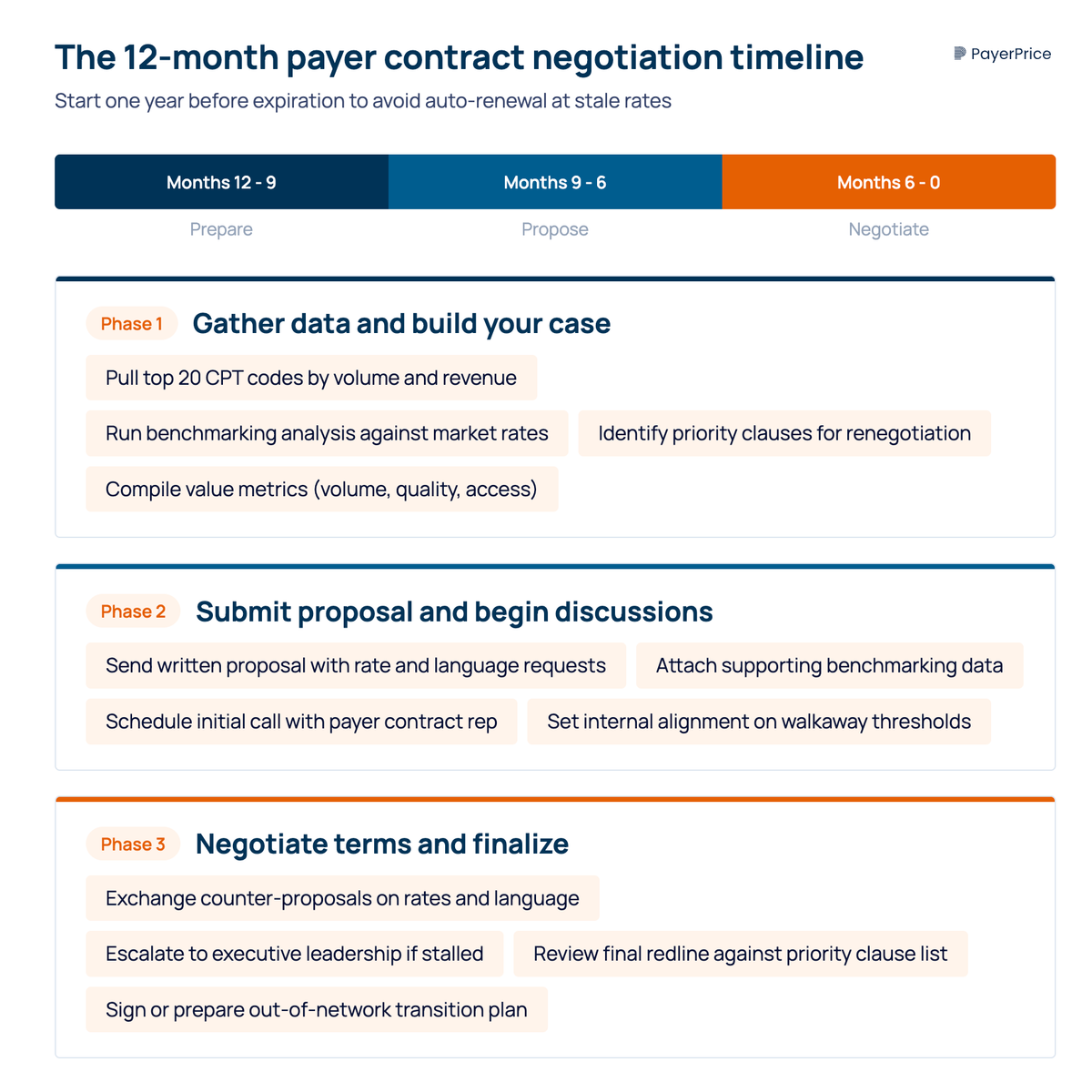 - Months 12-9: Gather data on your top codes, run benchmarking analysis, identify priority clauses for renegotiation