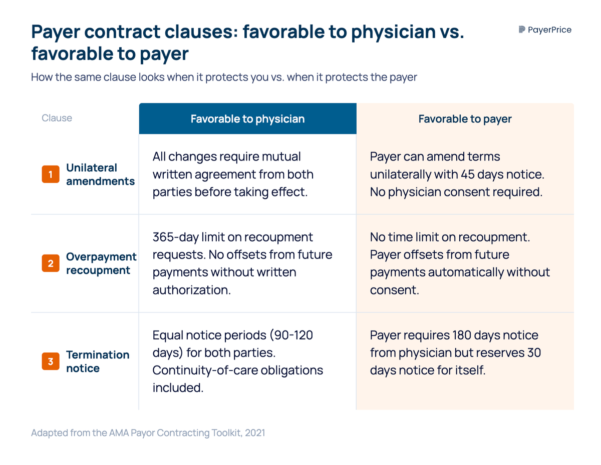 The AMA's Payor Contracting Toolkit provides side-by-side contract language comparisons showing "favorable to physician" vs. "favorable to payor" versions of the same clauses. Here are the five clauses that cost physician groups the most, drawn from that toolkit: