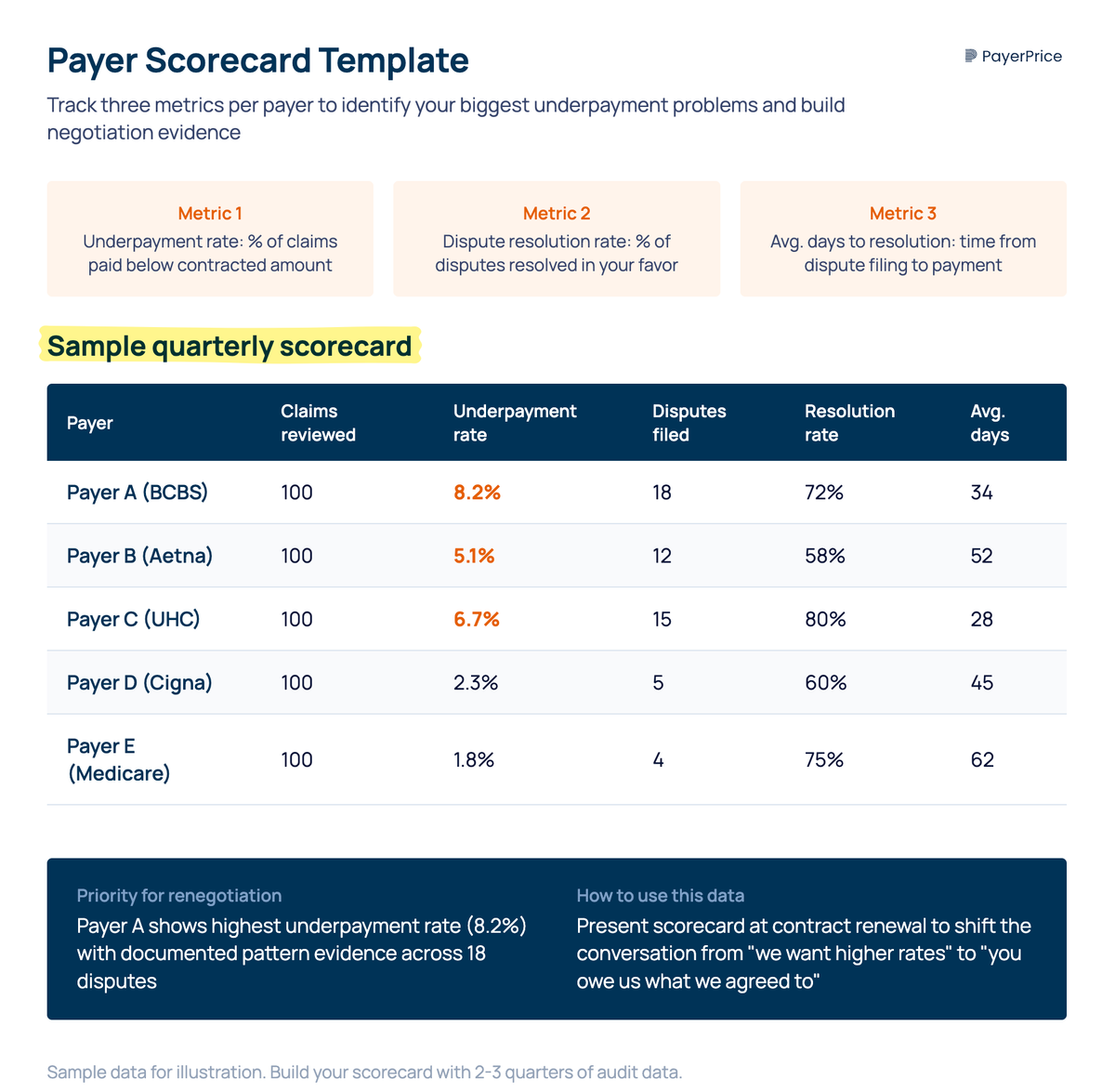 Build a payer scorecard that tracks three metrics per payer: underpayment rate (percentage of claims paid below contracted amount), dispute resolution rate (percentage of disputes resolved in your favor), and average days to resolution. After two or three quarters of data, this scorecard tells you which payers are your biggest problems and gives you evidence when you renegotiate.
