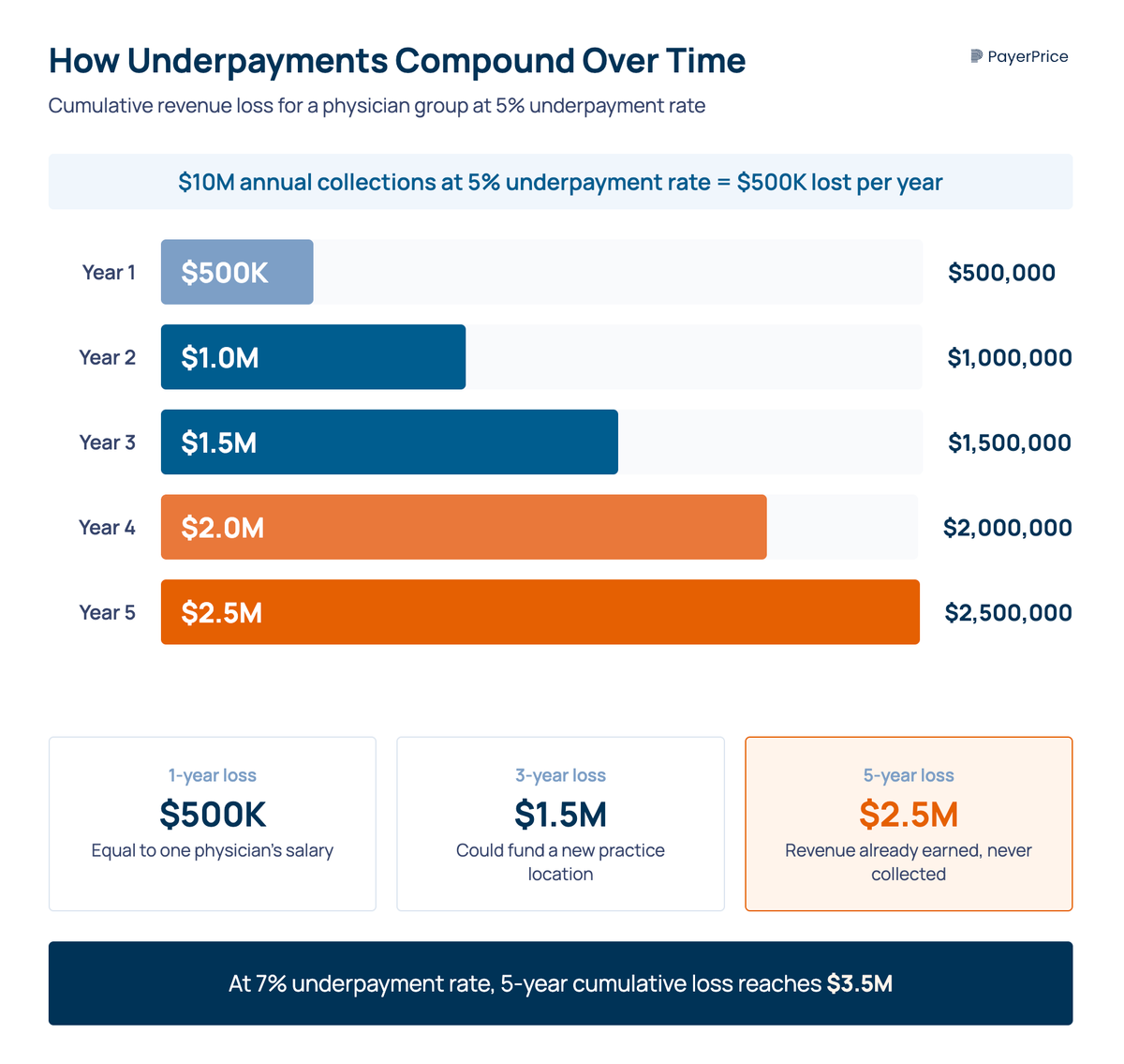 A physician group collecting $10 million annually and losing 5% to underpayments is losing $500,000 every year. Over five years, that is $2.5 million in revenue already earned that payers kept.