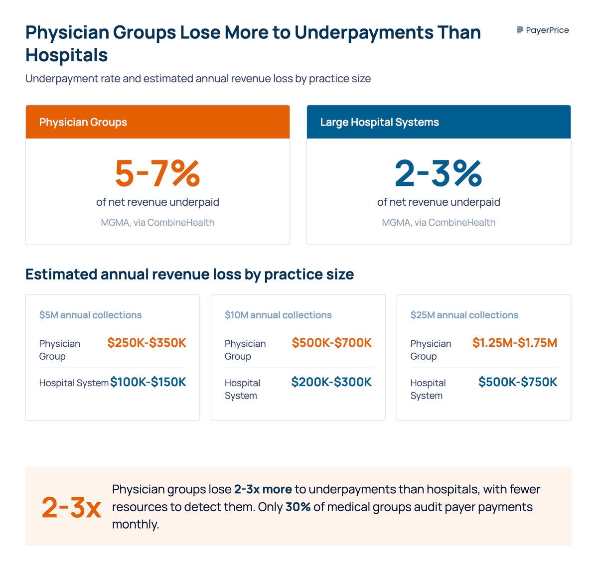 According to CombineHealth (citing MGMA data), small-to-midsize physician groups experience underpayment rates of 5-7%, compared to 2-3% for large hospital systems.